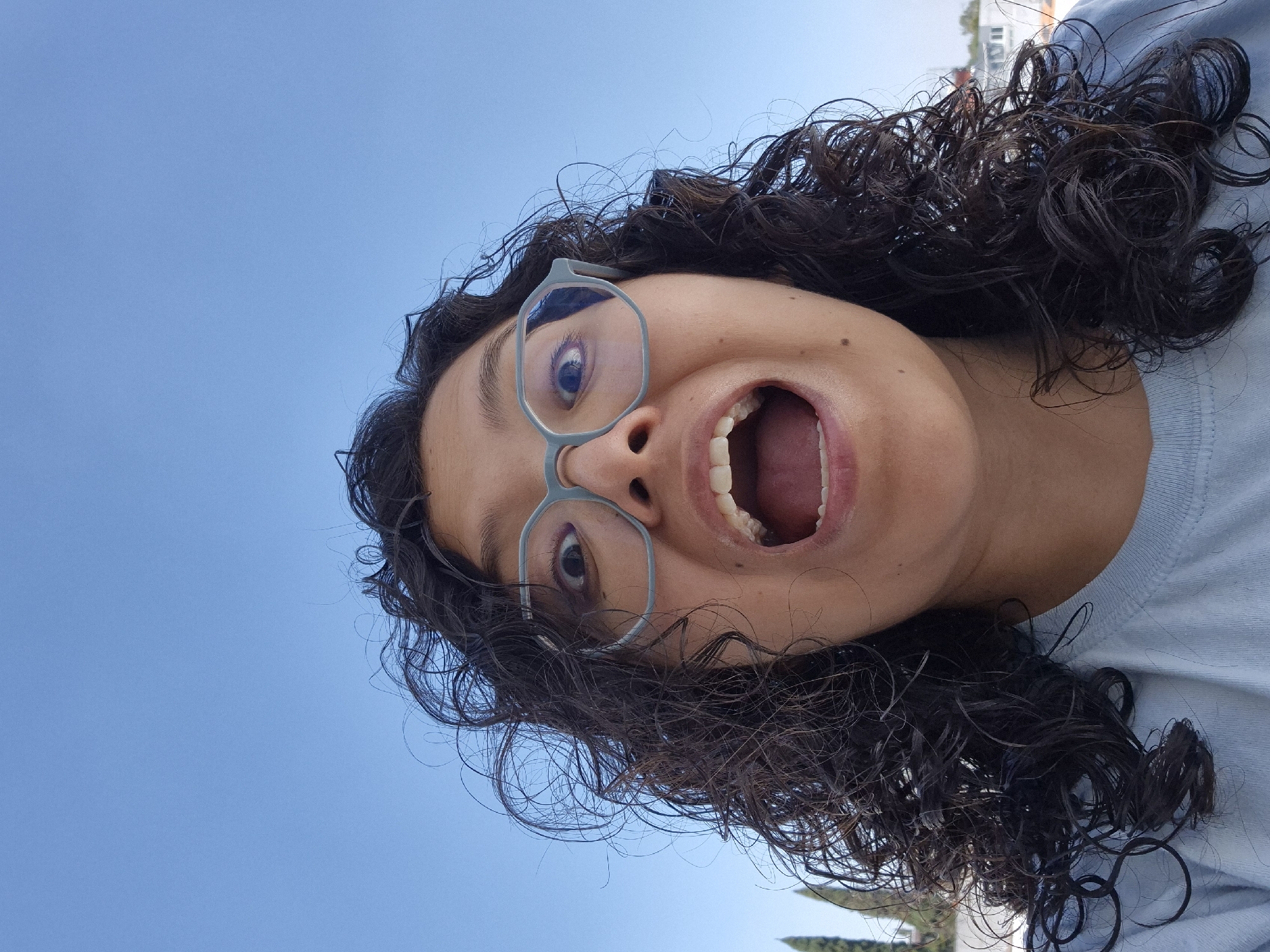 An upward-angled close-up photograph captures an individual, likely female, with dark, wet-appearing curly hair, centered against a clear blue sky. The subject wears light blue, polygonal-framed eyeglasses and a light blue t-shirt. Her face is wide-eyed with dilated pupils and her mouth is open in an exaggerated expression, revealing her upper and lower teeth and tongue. A small mole is visible on her right cheek. In the distant background, to the left, two tall, slender green trees are partially visible. On the far right, faint white architectural structures with visible windows are discernible. The scene is outdoors, under bright daylight conditions, in the city of Puebla, Mexico.