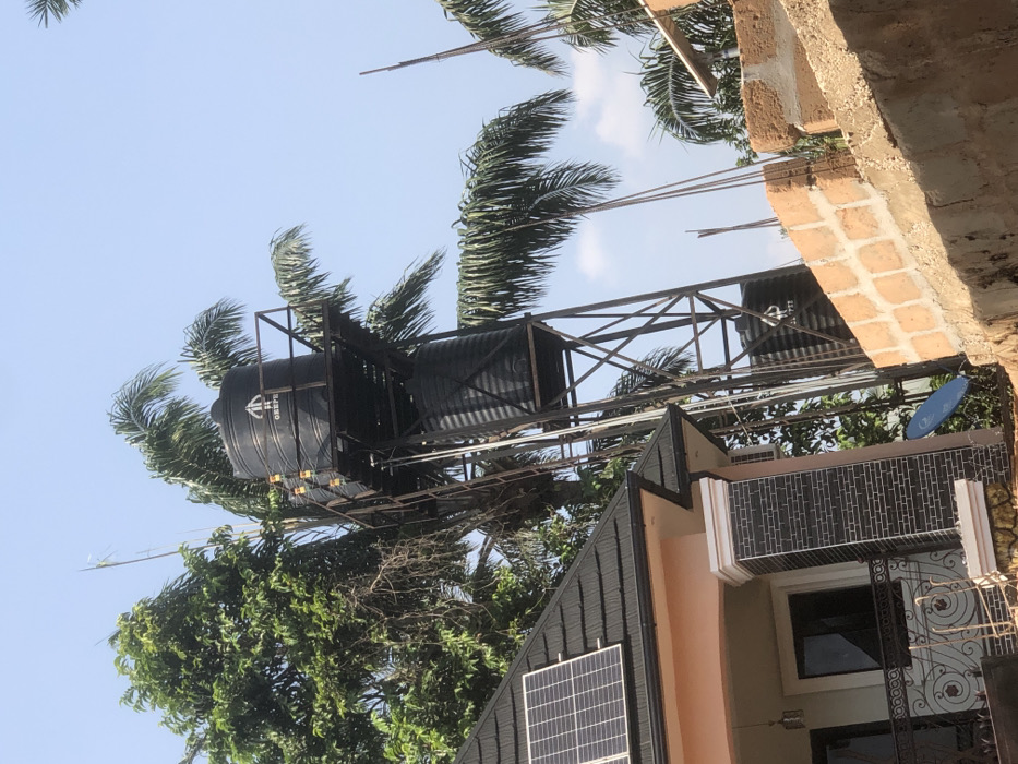 The image displays an outdoor residential scene in Ifitedunu, Nigeria, under a clear, cloudless blue sky. In the left foreground, a section of a contemporary house is visible, featuring a dark-tiled roof with two rectangular solar panels mounted on it. The house exterior is light peach-colored, with a column on the porch clad in dark grey brick and adorned with decorative black metal railings. A dark-paned window is visible on the house facade. A blue satellite dish is positioned on the ground near the house structure. Dominating the central and right portions of the image is a tall, dark metal water tower, constructed with a lattice-work frame of beams and cross-bracing. This tower supports three black, cylindrical plastic water storage tanks. The topmost tank, prominently labeled "OHEPEE," has several yellow/orange-colored devices or sensors attached to its side. A second, similar but slightly smaller tank is positioned on a lower platform, and a third tank is partially visible near the base of the tower structure. To the right, an unfinished or under-construction wall or structure is present, built with light orange/terra cotta colored bricks. Multiple vertical steel reinforcing bars (rebar) protrude from the top of this brickwork and a concrete foundation below it. The background features dense tropical vegetation, including tall, green leafy trees on the left and numerous prominent palm trees with long fronds extending across the midground and right. No human figures are visible in the scene.