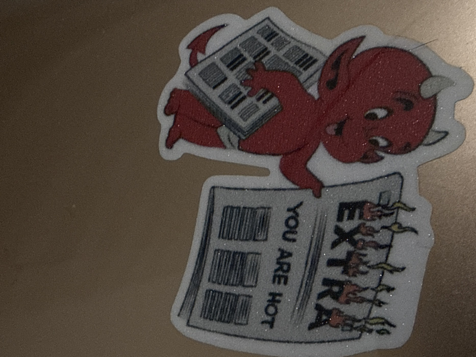 A devil cartoon character in red with horns and a tail lies on top of two gray and white objects. The upper object appears to be a stack of cash or books, while the lower object is a newspaper. The newspaper reads "EXTRA" in flaming letters, underneath which it says "YOU ARE HOT" in plain gray letters. The entire image has a glittery sheen.