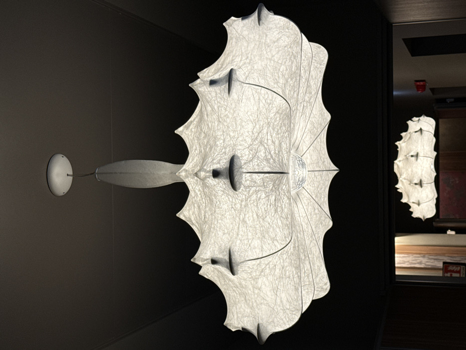 - "A large, illuminated chandelier, constructed from a translucent, fibrous white material with a textured, crinkled surface, hangs prominently from a dark ceiling" by FM-kvEG43, licensed under CC BY 4.0