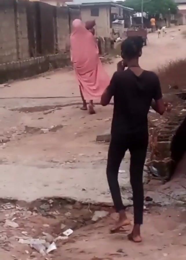 A video shows a person wearing a pink robe walking down a partially paved road towards the background while a person wearing black clothes walks in the same direction along the road in the foreground. The first person appears to be carrying a child. The road is damaged with missing pieces of pavement and a dirt shoulder along the edges. Buildings are visible on either side of the road and a palm tree is in the background.