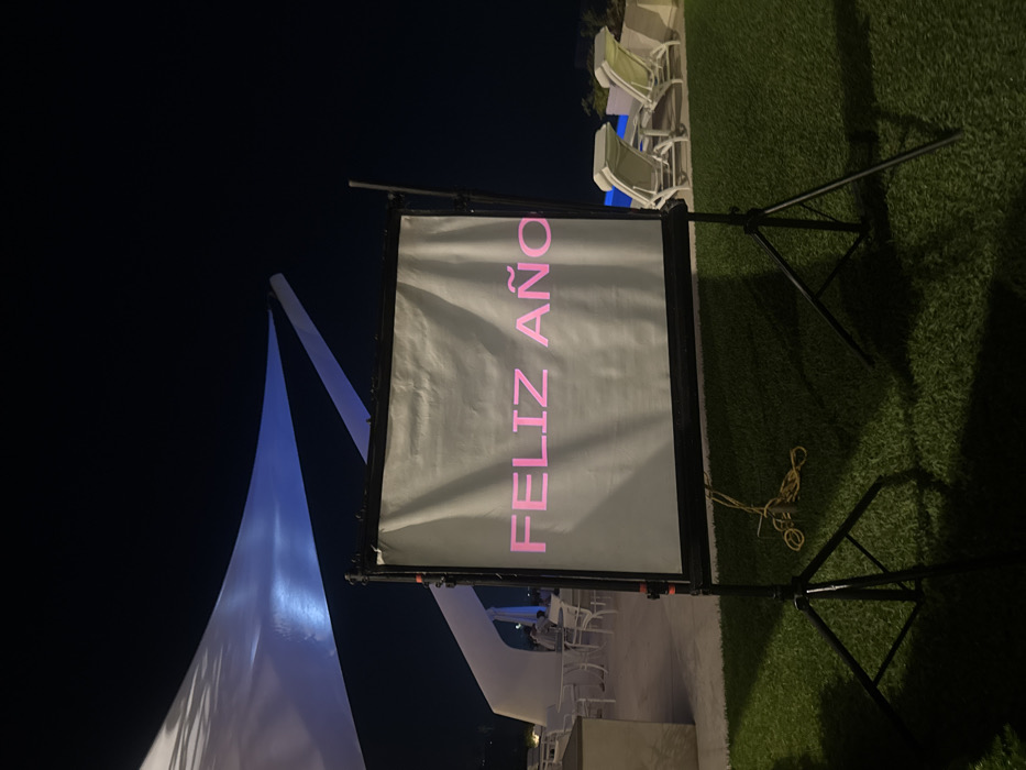 This image captures an outdoor nighttime scene at a resort or event venue in Acapulco, Mexico. A portable white screen, positioned centrally and supported by a black tripod stand, displays the phrase "FELIZ AÑO" (Happy New Year) in prominent pink, illuminated capital letters. The foreground consists of a groomed green surface, resembling artificial turf or carpet, with a coiled beige rope or cable lying near the base of the screen's stand. To the left of the screen, a structured dining or lounge area features multiple white tables and chairs arranged beneath large, sweeping white tensile fabric canopies. These canopies are illuminated from below or behind with a distinct blue light. Several indistinct figures of people are visible, seated at the tables, suggesting social activity. To the right of the screen, two white reclining lounge chairs are visible, positioned near what appears to be a swimming pool that emanates a subtle blue light. Low white walls or architectural dividers define this area. The background is a dark, clear night sky. No specific interactions or actions beyond sitting are discernible from the individuals present.