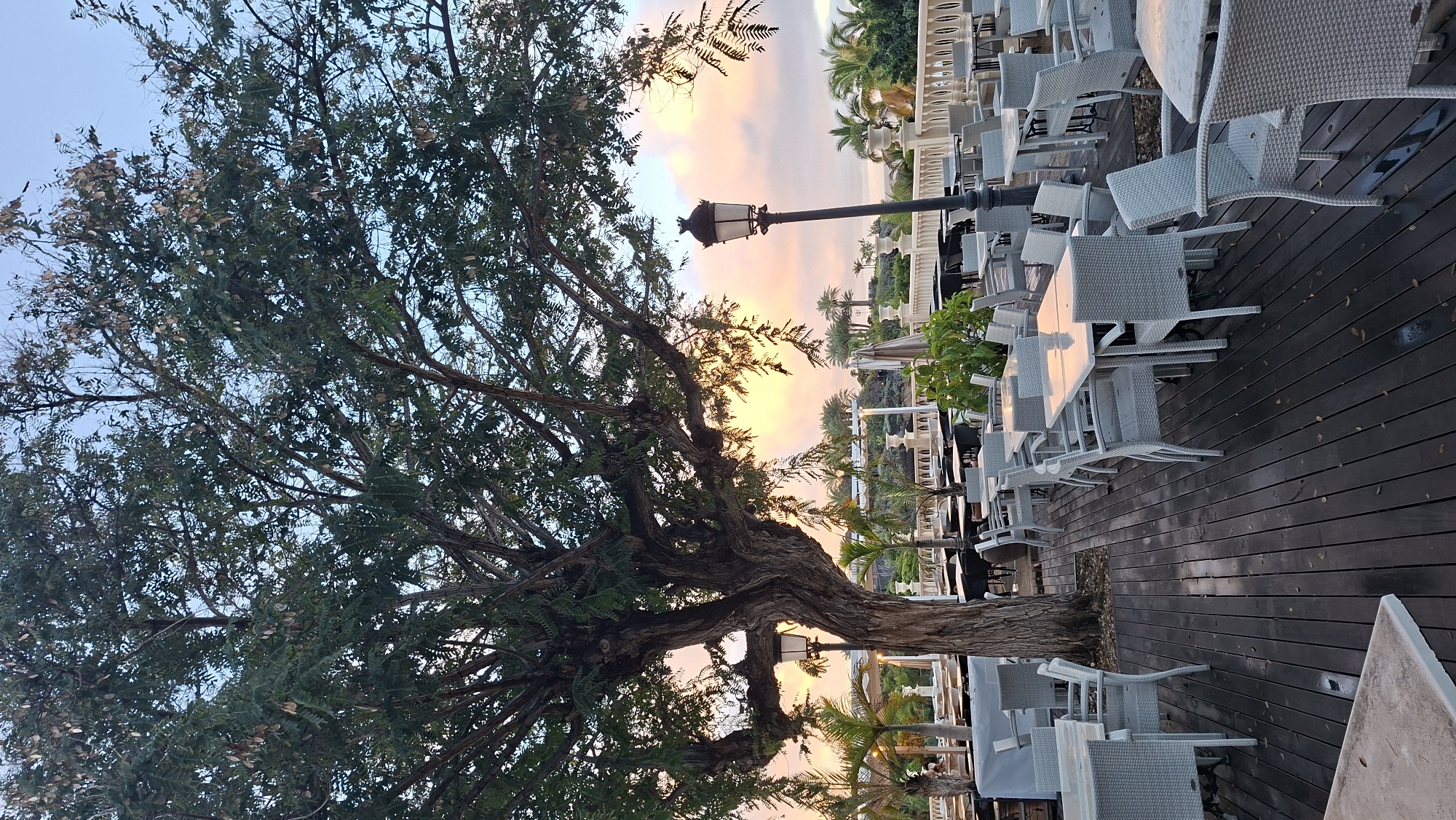 The image displays an unoccupied outdoor dining terrace in Costa Adeje-playas Del Duque, Spain, illuminated by the light of either dawn or dusk, evidenced by the sky's blend of pink, orange, yellow, and blue hues. A large, mature tree with a textured trunk and green foliage, including discernible dry seed pods, is centrally positioned on dark wooden decking. This decking is furnished with multiple square and rectangular tables featuring light-colored, reflective surfaces, surrounded by light-colored, wicker-style chairs. Reflections of the colorful sky are visible on the tabletops. An ornate black lamppost with a decorative finial stands on the right side of the terrace, and another is partially visible behind the tree on the left. Beyond a white balustrade marking the terrace edge, a landscaped area with numerous palm trees and other green vegetation is visible. No individuals are present within the scene.