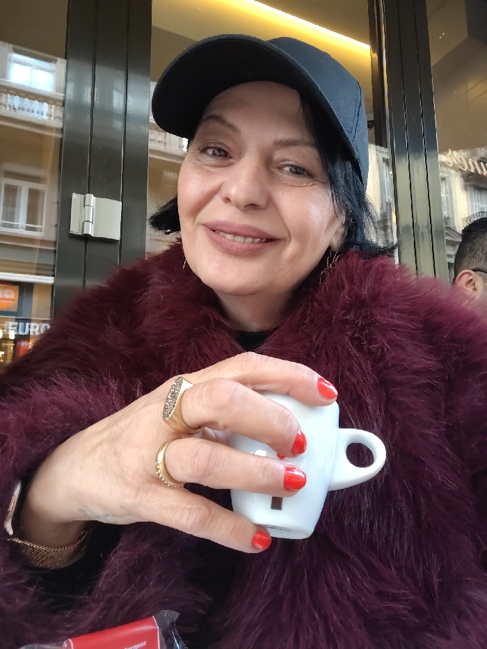 A medium close-up image captures a woman seated indoors, likely within a cafe, with a city street scene reflected in the glass partition behind her. **People:** The primary subject is a middle-aged woman with dark hair, wearing a black baseball cap and a dark maroon faux fur coat over a black top. She smiles faintly, looking directly at the viewer. Her left hand is prominently featured, holding a small white cup. Her fingernails are painted bright red. She wears a wide, gold-toned ring adorned with multiple small stones on her left ring finger, and a narrower gold-toned band with similar stones on her middle finger. A gold-toned mesh bracelet is visible on her left wrist. Partially visible in the blurry background to the right is the back of a person's head, appearing male, with dark hair and eyeglasses, also seemingly seated within the same establishment. **Objects:** The woman holds a small, white ceramic espresso cup with a single handle and a black rectangular vertical design on its side. A red, partially obscured wrapper (possibly for sugar or chocolate) rests on a surface in the lower-left foreground. **Actions/Interactions:** The woman is holding the cup with her left hand, gripping its body rather than the handle. Her direct gaze and slight smile suggest she is posing for the photograph. **Environment:** The setting is an indoor space, likely a cafe, characterized by warm yellow ambient lighting visible along the top edge of the frame. A dark vertical structural element, possibly a window frame or pillar, with a large, silver-toned hinge, is positioned behind the woman's left shoulder. This interior space features a large glass partition or window through which an urban street scene is reflected. **Location in Strasbourg, France:** The reflection in the glass reveals typical European city architecture, including multi-story buildings with light-colored facades, ornate balconies, and numerous windows. A commercial storefront sign is partially legible in the reflection, displaying the letters "EURO" followed by other indistinct characters. This architectural style and the presence of commercial establishments are consistent with the historic city center of Strasbourg, France. The exact street or building name is not discernible from the visible details.
