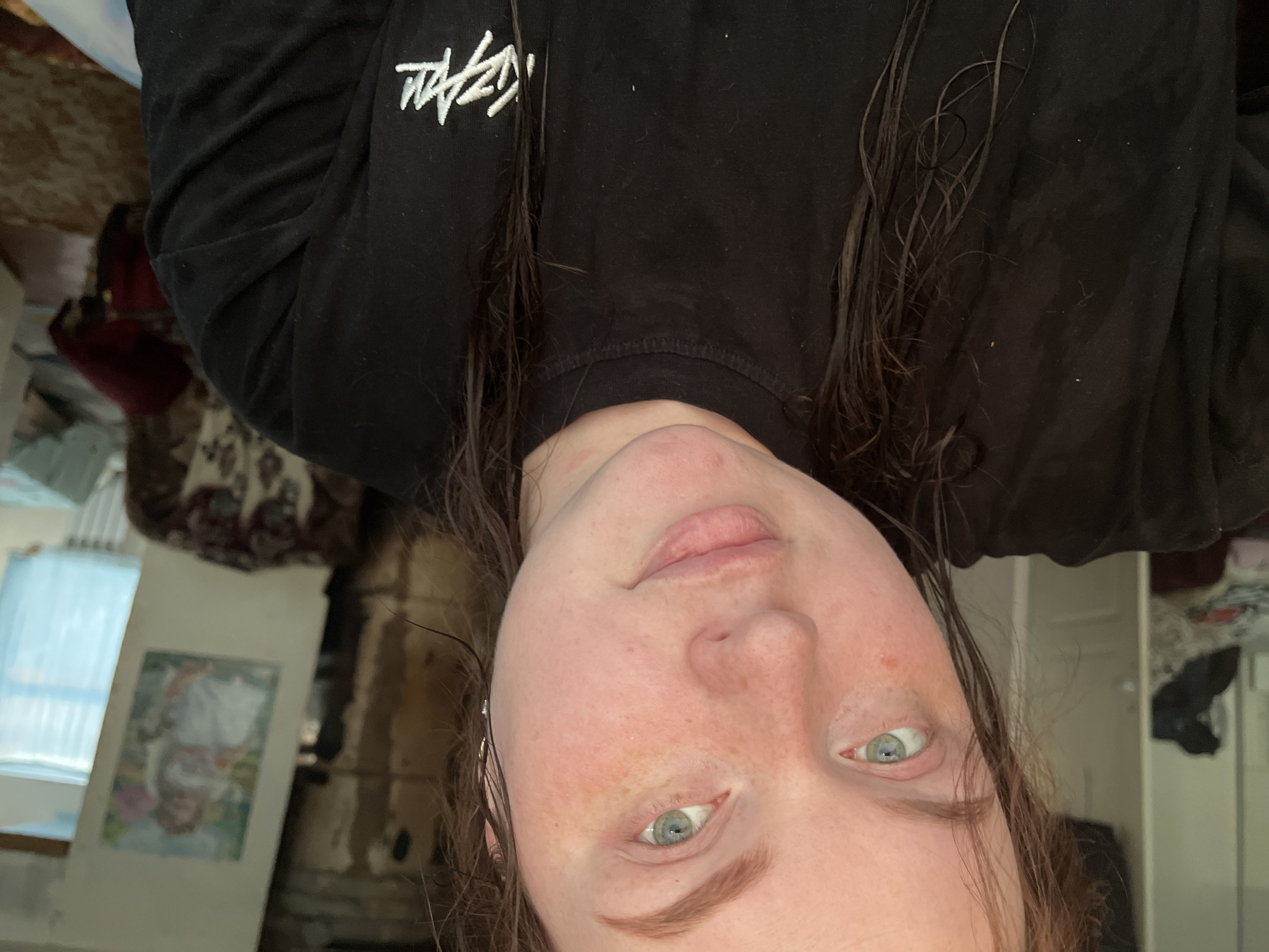 The image depicts a female individual in a domestic indoor setting, specifically identified as being in the city of Павловка, Russia. The subject is a light-skinned female with reddish-brown hair, which appears damp and hangs over her shoulders and chest. Her face exhibits a pale complexion with visible freckles across her nose and cheeks, and minor reddish patches on her skin. She has blue-green eyes and light brown eyebrows. Her lips are naturally colored and slightly parted in a neutral expression. She wears a black long-sleeved shirt with a white stylized logo or text, possibly "KZAM," embroidered on the lower right side of the chest. The photograph is a close-up, appearing to be a selfie, taken at a slight upward angle, with the subject looking directly into the camera. The background reveals a partially visible room. To the left of the subject, a light-colored door or wall is seen, with what appears to be a pile of folded or discarded clothing on a surface behind it. To the right of the subject, the background is more detailed: a dark, textured wall or wooden panel is visible. Affixed to a lighter vertical surface (possibly a door or wall panel) is a framed picture depicting a young girl in a white dress, potentially holding an animal, in a colorful outdoor scene. Below the picture, part of an ornate armchair or sofa upholstered in a patterned fabric (featuring browns, reds, and white) is visible. Further to the right, a window with light blue curtains is present, underneath which a white radiator is installed. A patterned rug in tones of brown, red, and beige covers a section of the floor. The environment appears lived-in, with natural light entering from the window.