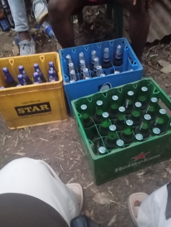 Three crates of beer sit on the ground outdoors. A yellow crate marked "STAR" holds dark bottles with blue labels. A blue crate beside it contains brown bottles with silver caps. The green crate closest to the camera has the Heineken logo and is full of green bottles with silver caps. Parts of people's legs and feet are visible around the crates. The ground is dirt with scattered twigs and leaves.