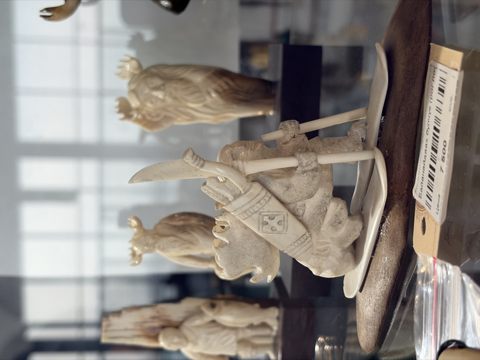 A display case contains several ivory-colored carvings. The main figure is a hunter on skis, wearing a quiver and holding a knife. Above and below are carvings of animals in motion, possibly birds or mammals. A price tag is visible, with a price of 7,500. The carvings are displayed on dark wooden bases. The case is likely in a museum or gallery.