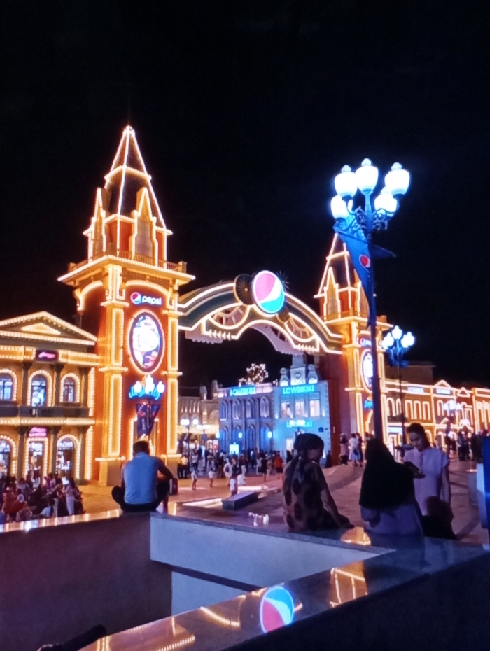 The image displays an illuminated outdoor public space at night in Gulistan, Uzbekistan. A prominent, ornate archway structure dominates the background, flanked by two multi-story tower-like buildings with pointed roofs, all extensively outlined with warm-toned string lights. The left tower features a visible Pepsi logo. An arched canopy, similarly illuminated, connects the two towers and displays a large, circular Pepsi logo at its center. Beyond this archway, several other buildings are visible, one of which is illuminated with blue lighting and marked with "LC Waikiki" signage. In the mid-ground to the right, a multi-lamp streetlight with blue-white bulbs stands, featuring a small Pepsi flag. The foreground contains a low, light-colored barrier or ledge with reflective surfaces, displaying a small, illuminated Pepsi logo. Three individuals are seated on this barrier: one male in a light blue shirt positioned with his back to the camera, one person wearing a patterned garment, and another person with a dark head covering. A fourth individual stands nearby to the right. Numerous other people are visible walking and congregating in the open area beyond the foreground barrier, near the illuminated structures. The sky is dark, indicating nighttime.