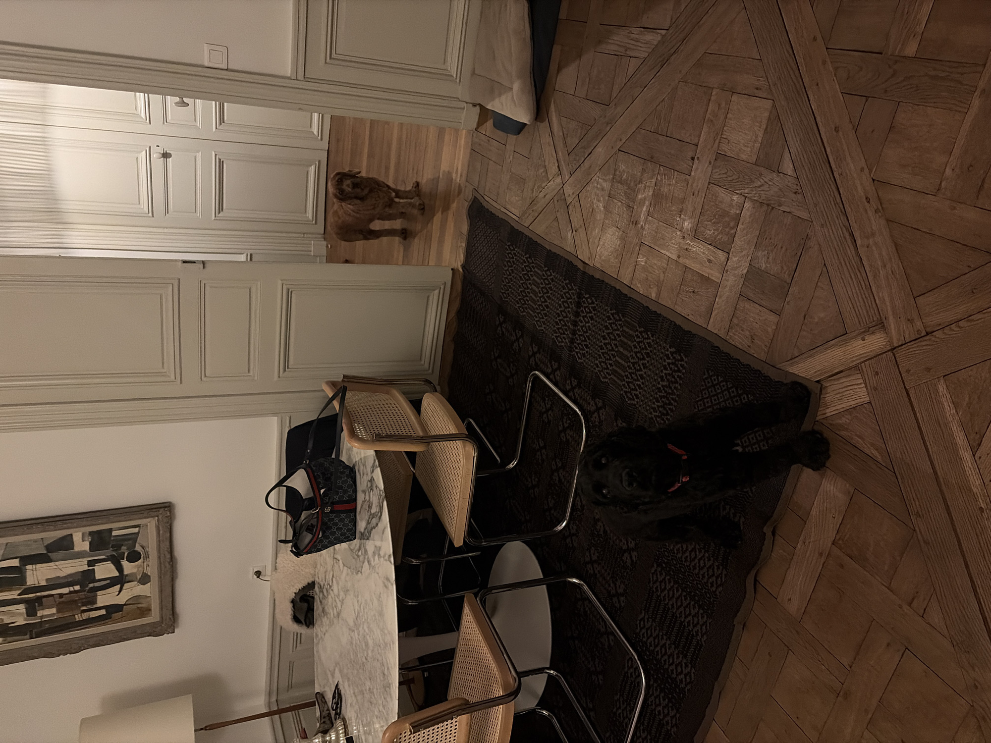 The image depicts the interior of a residence, consistent with the architectural style of a classic Parisian apartment, identifiable by its ornate white wall paneling (boiseries), high ceilings, and *point de Hongrie* parquet flooring. In the foreground, a black dog, possibly a Cocker Spaniel, wearing a red collar, lies on a dark, geometrically patterned rug. To the left, a round white marble-topped dining table is surrounded by four chairs with cane backs and seats and chrome tubular frames. On one chair, a black and white Gucci Ophidia tote bag with green and red stripe accents is visible. A tall floor lamp with a cream shade stands nearby, and an abstract framed painting hangs on the white wall above the table. Through an open, paneled doorway in the mid-ground, a reddish-brown dog, similar in breed to the black dog, stands in an adjoining room, looking forward. This adjacent room also features parquet flooring and white paneled walls. A light-colored pet bed rests on the floor near the doorway in the background room. The scene is illuminated by interior lighting.
