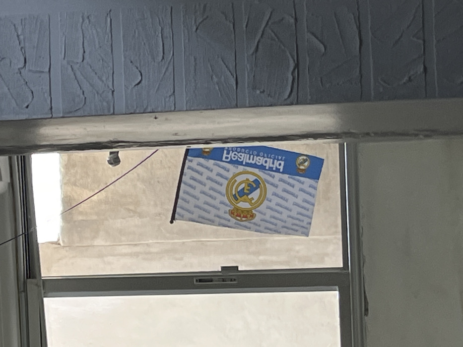 An indoor perspective frames a view out a window in Rukn ad-Din Municipality, Syria. To the right, a vertical section of a light blue-gray textured wall, designed to mimic stacked rectangular bricks, runs alongside a smooth, light gray vertical beam or window frame component. The window, partially visible on the left, features a white or light-colored frame with a dark sliding mechanism. Through the open section of the window, a Real Madrid football club flag is suspended. The flag is predominantly white, displaying the club's crest in yellow and blue, and the text "Real Madrid" in dark blue, appearing reversed, indicating it is viewed from the rear. Beyond the window and flag, an exterior wall of a building or courtyard, rendered in a light beige or sandy color, is visible under bright illumination. A thin, dark diagonal line, possibly a wire or string, stretches across this background wall. No individuals are present in the scene.