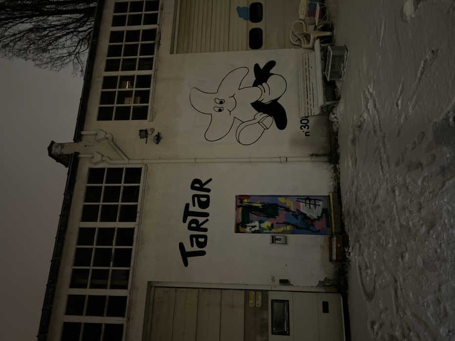 A white two-story building stands at dusk or dawn, showcasing numerous windows. The word "Tartar" is painted in large black letters. A cartoon starfish character is also painted on the building, adjacent to "n°30." A colorful abstract art piece is located above a door. The ground is covered in snow, marked with footprints.