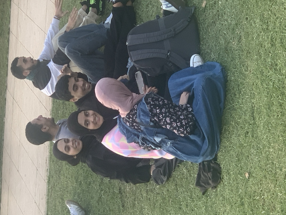 Six people are lying on the grass and on a paved surface, posing for a photo. Most are smiling. Several are wearing headscarves. One person is holding a phone. There is a backpack on the grass and a pair of legs in blue jeans and a white shoe.