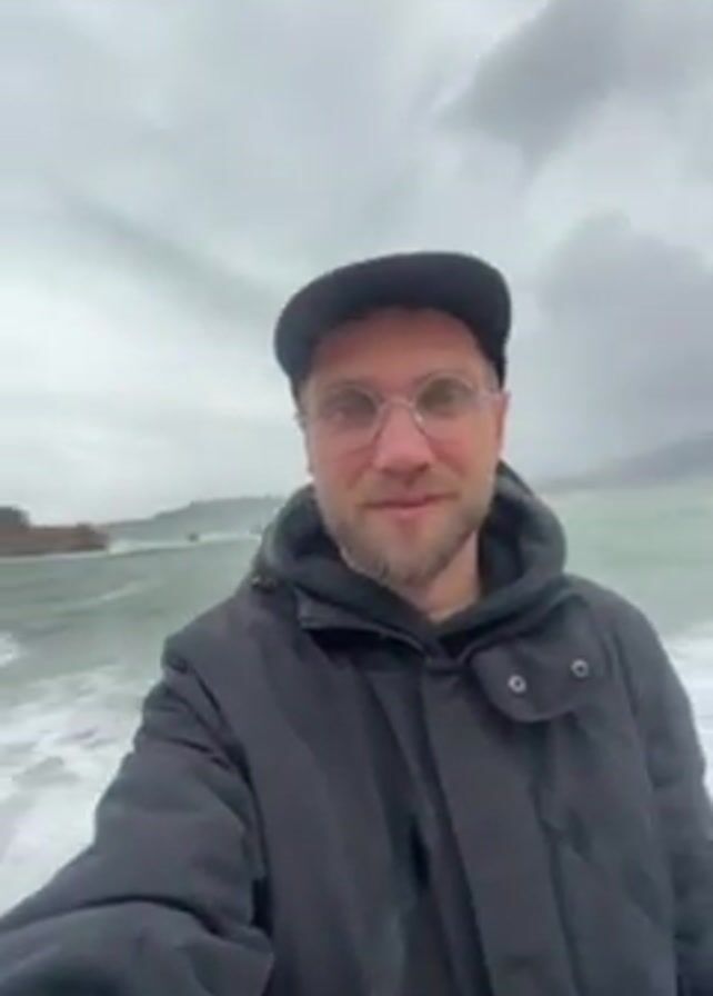 man in a black jacket and cap standing on a beach. He wears glasses and has a beard. The waves are crashing behind him, and the sky is overcast. He looks into the camera and smiles, holding his thumb up.