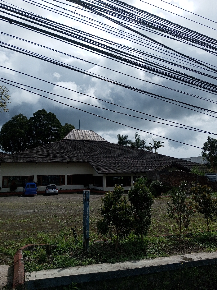 The image displays an outdoor scene in the city of Taohom, Laos. The sky is heavily overcast with dark grey clouds. Numerous black electrical or communication wires stretch diagonally across the upper half of the frame. In the mid-ground, a single-story building with a multi-gabled, dark-tiled roof and a central, lighter-colored pyramidal roof section is visible. The building's walls are light-colored, featuring a series of rectangular windows. Two vehicles are parked on an unpaved dirt and grass lot in front of the building: a blue van or utility vehicle on the left, and a white compact car to its right. Large, dark green trees are present behind and to the left of the building, with palm trees visible to the right. The foreground shows a concrete curb, an area of sparse grass and dirt, small bushes, saplings, and a weathered blue-painted vertical post. No individuals are visible.