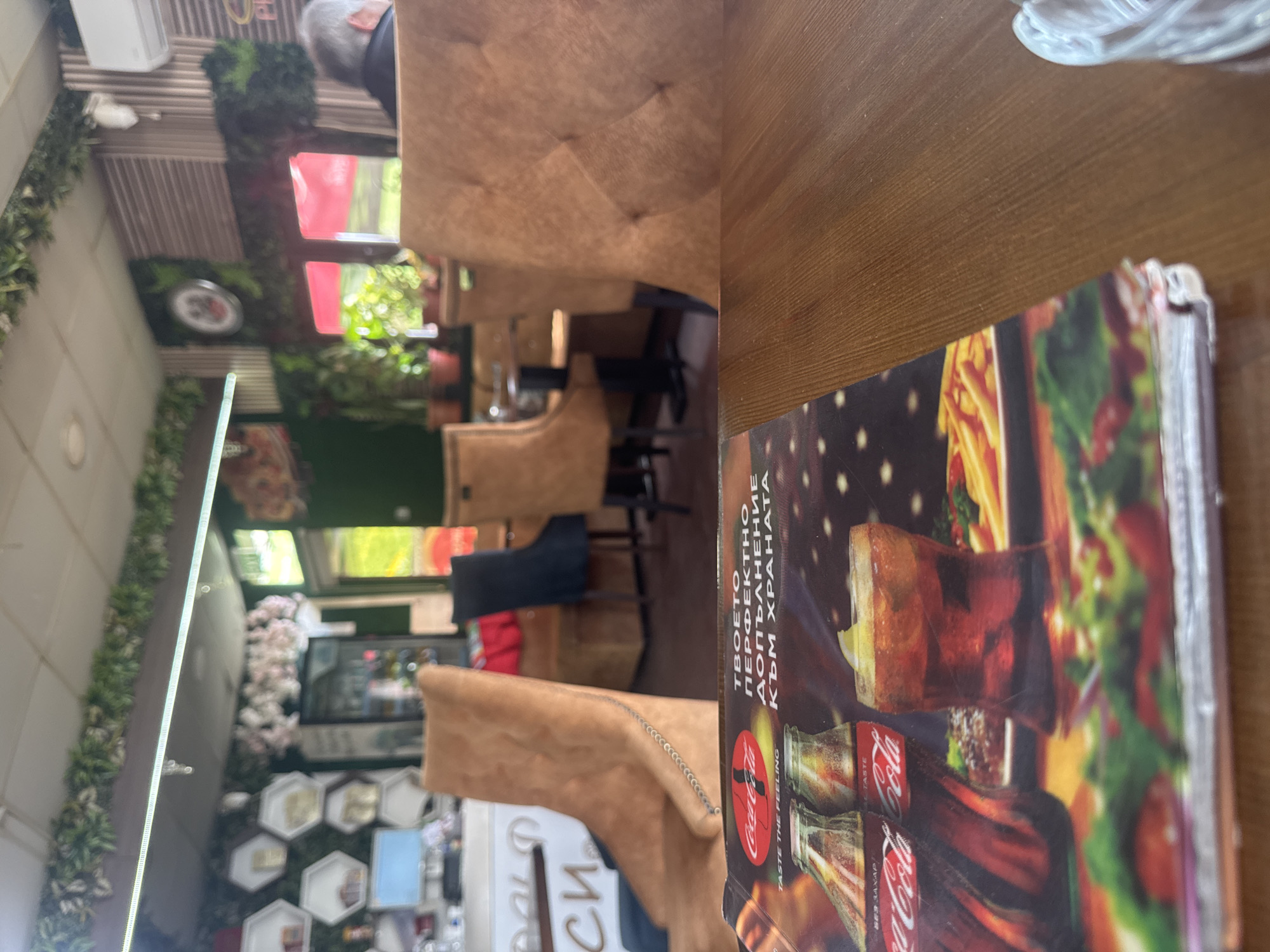 table at a restaurant in Draginovo, Bulgaria. A menu, advertising Coca-Cola, is on the table. Seating is in the background. A person is in the far background. A facade covered with greenery is visible through a window.