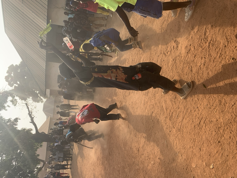 A crowd of people is gathered on a dirt ground. Several people are bent over or lying down, some kicking up dust. A person in dark clothing is standing, holding objects aloft. Other individuals are visible in the background, and a building is partially seen on the left side, near a tree. The lighting suggests it's either sunrise or sunset, with a hazy or dusty atmosphere.
