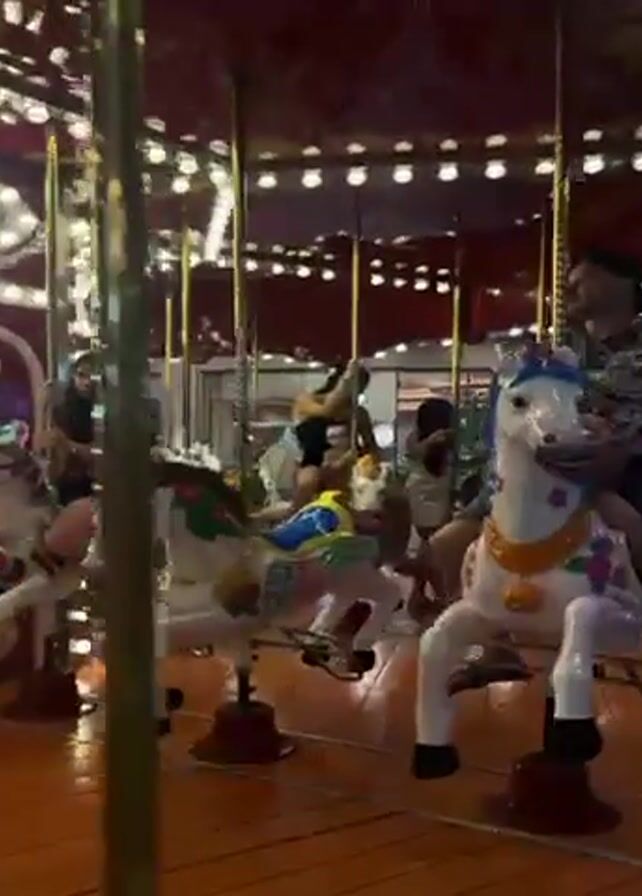 The video depicts a carousel in motion, filled with riders on brightly painted horses