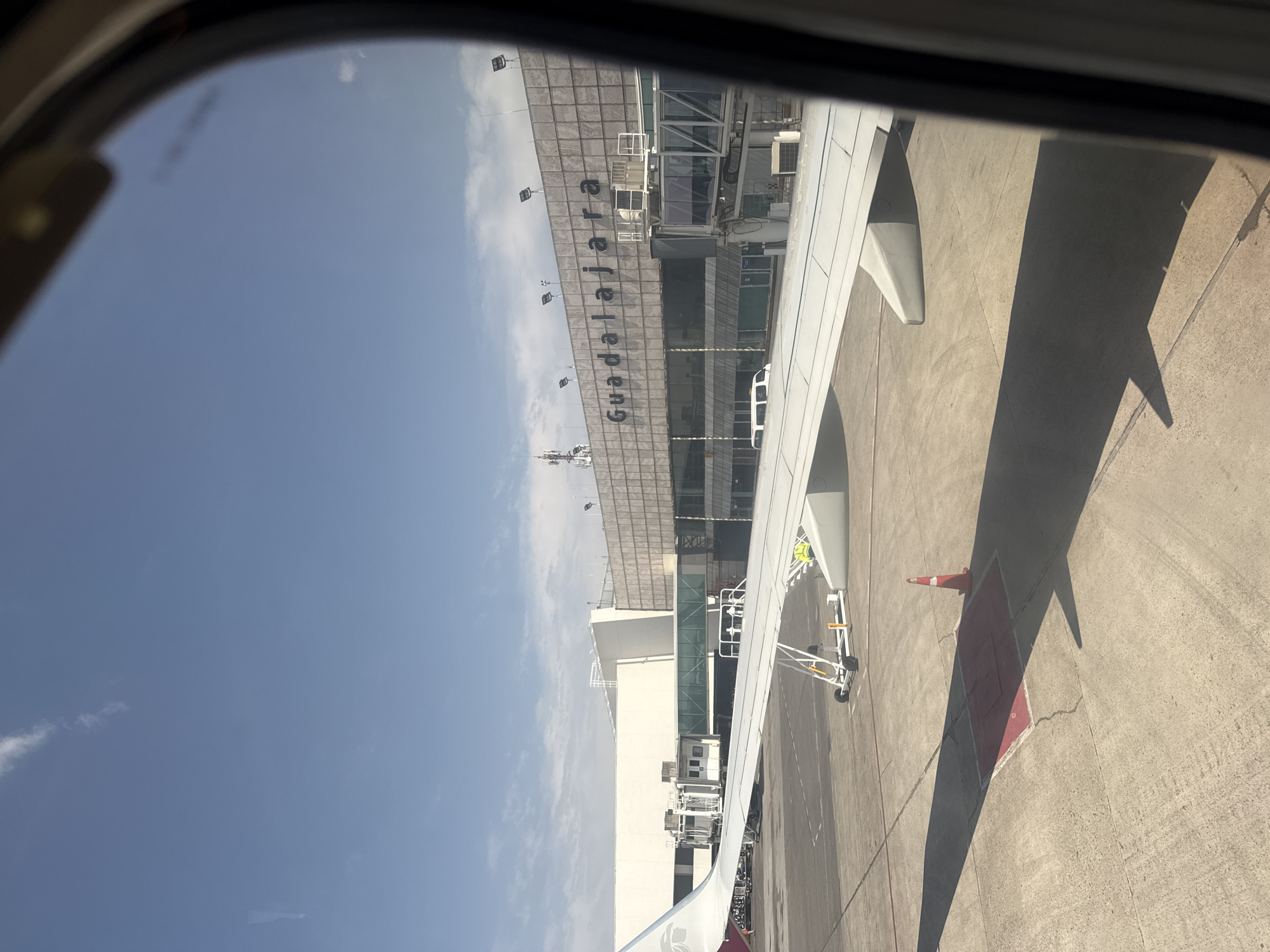view from an airplane window at Guadalajara International Airport in Guadalajara, Mexico. The wing of the plane is visible in the foreground. The airport building, with "Guadalajara" printed on it, is visible in the background. The sky is blue with some clouds. On the ground, there is a red and white object, and a shadow of the airplane wing.