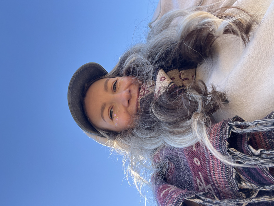The image displays an adult female in Škaljari, Montenegro, captured from a low-angle perspective against a clear, bright blue sky. The subject is smiling with visible teeth, looking directly at the camera. She has long, voluminous wavy hair with prominent gray and brown strands. Pink and iridescent glitter is applied to her upper cheeks. She wears a dark gray or olive green baseball cap backward on her head. Her attire includes a light-colored (beige/off-white) garment, and two scarves: an outer scarf with deep red, purple, black, and beige geometric patterns and fringed edges, and an inner scarf or section in beige with brown patterns around her neck.