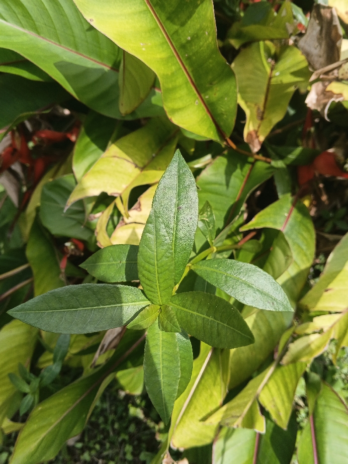 Lush greenery dominates the frame, showcasing vibrant green leaves of varying sizes and shapes. A central plant with pointed, symmetrical leaves takes focus, surrounded by broader, more textured leaves with yellow and red accents. Sunlight illuminates the scene, creating a mix of light and shadow that emphasizes the different layers and textures of the foliage. The composition evokes a sense of natural growth and vibrant plant life.
