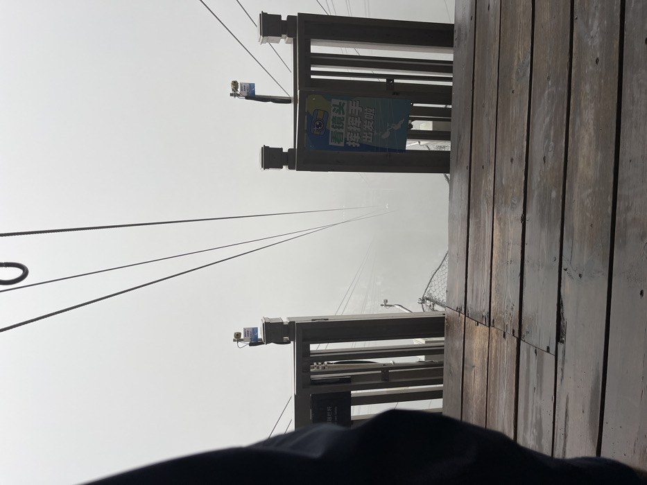 foggy suspension bridge. Wooden planks make up the side of the bridge in the foreground. Metal railings flank the sides, with signs attached. Thick cables stretch across the foggy expanse, disappearing into the distance. The scene is overcast, creating a gray and muted color palette. A dark shape, possibly clothing, is visible in the bottom foreground.