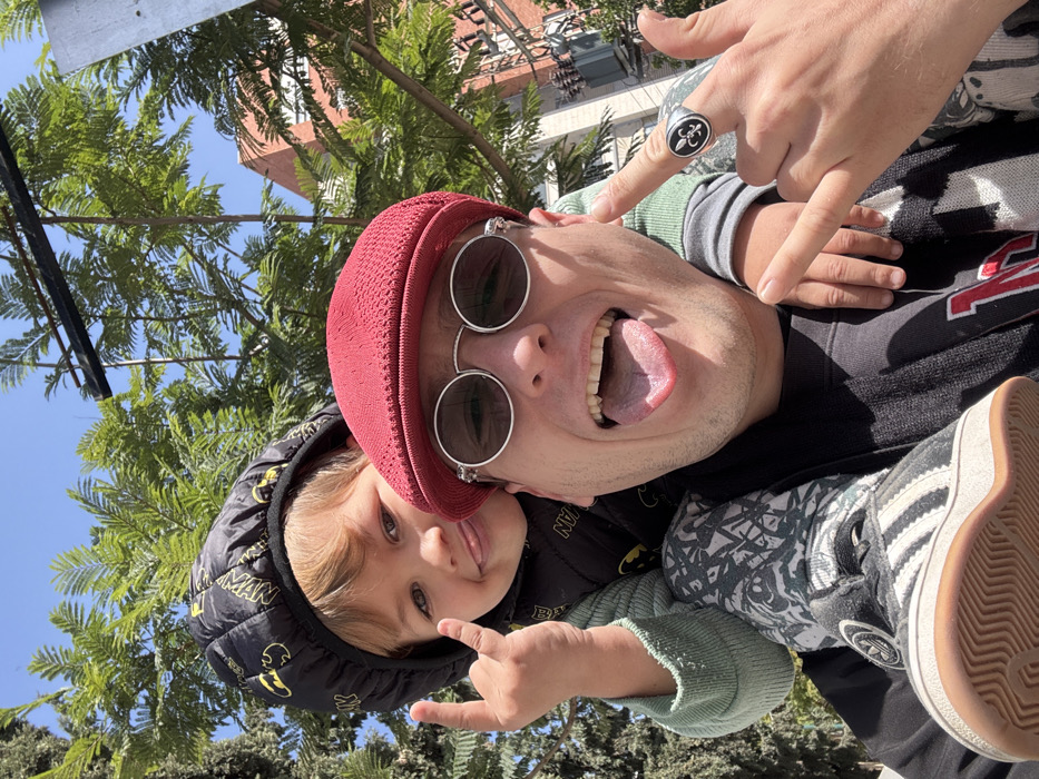 The image depicts an adult male giving a shoulder ride to a young child outdoors in Givatayim, Israel. The adult, wearing a red mesh flat cap, round sunglasses, and a dark garment, is seen extending his tongue and performing a "rock on" hand gesture with his left hand; a silver ring with a black oval featuring a white fleur-de-lis design is visible on his left ring finger. The child, positioned on the adult's shoulders, has light brown hair and is dressed in a black quilted vest adorned with yellow Batman symbols over a light green long-sleeved shirt. The child also extends their tongue and makes a "rock on" hand gesture with their left hand, while a black and white striped Adidas sneaker is visible on their right foot. The background features lush green trees under a clear blue sky, with a partial view of a brick building discernible through the foliage on the right side.