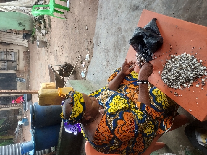 An adult female is depicted performing an activity in an outdoor residential or communal area in Nkpor, Nigeria. The subject, an older woman, is seated on an orange plastic chair, facing downwards, and is dressed in a vibrant, multi-colored patterned fabric (orange, blue, yellow, black) with a matching headwrap. She wears a beaded bracelet on her left wrist. On an orange rectangular table in front of her, she is actively processing small, off-white, seed-like objects, seemingly shelling or sorting them. A substantial pile of these processed objects rests directly on the table surface, intermingled with discarded shell fragments. An open black plastic bag containing additional unprocessed material is also on the table. The surrounding environment consists of an unpaved, reddish-brown dirt ground. To the left of the main subject, two large blue plastic drums and a purple plastic basket are situated on a low concrete ledge, adjacent to a yellow plastic pitcher. In the midground, a wheelbarrow and two yellow plastic jerrycans are visible on the dirt. Further into the background, a single bright green plastic chair stands on the dirt, and various pieces of litter are scattered across the ground. Dilapidated building structures with worn facades and a barred window are present in the far background. A second, smaller individual wearing a red top is partially visible in the distant background, engaged with containers.