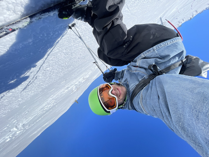 This image depicts a single individual taking an upward-angled selfie on a snow-covered mountain slope in the city of Jahorina, Bosnia and Herzegovina, under a clear, bright blue sky