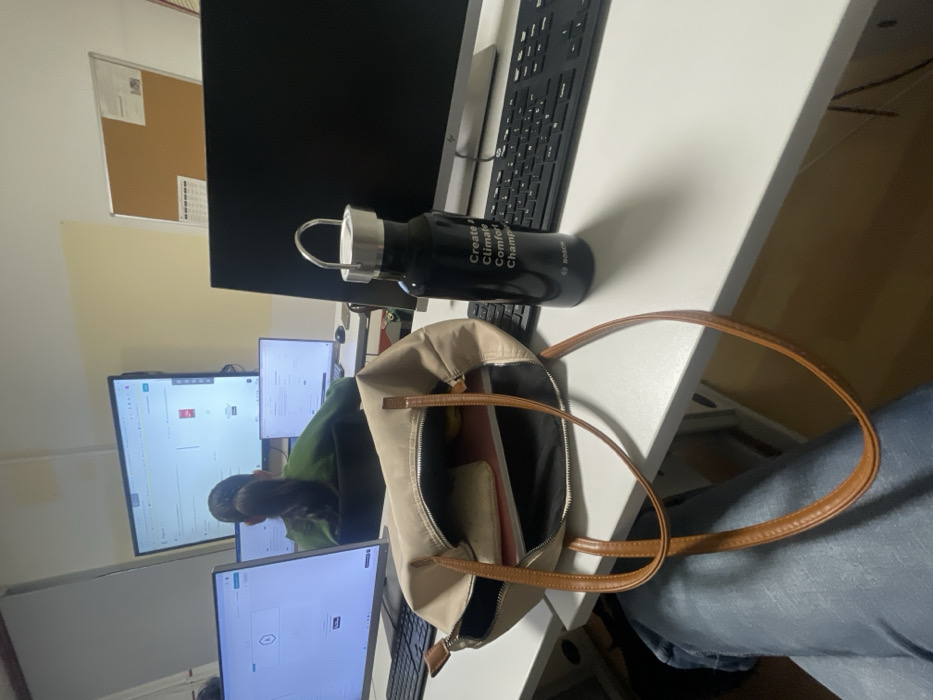 This image captures an interior office scene, specifically a workstation within a Bosch facility located at C/Haya, 2, 28020 Madrid, Spain. A single individual, with long dark hair tied in a ponytail, is seated with their back to the viewer, wearing a green long-sleeved garment. The individual is actively engaged with multiple computer screens. The workstation features a white desk. On the left, a beige shoulder bag with brown straps is partially unzipped, containing a red notebook and a light-colored object. To the right of the bag, a black insulated water bottle with a silver cap and a loop handle stands upright. The bottle bears the white text "Create Climate Comfort Champions" and a "BOSCH" logo. Two black computer keyboards are visible on the desk. The individual is surrounded by four screens: a large central monitor displaying a web interface with what appears to be data or a list, a laptop screen positioned below it also showing a user interface, and a third monitor to the left displaying a user creation form or similar application interface. A fourth, larger black HP monitor is positioned on the far right but appears off or displaying a dark screen. The background consists of light yellow walls, with a corkboard featuring documents and a calendar grid mounted on the wall to the right. The lower part of the image shows a person's legs clad in blue jeans, indicating the viewpoint is from a seated position opposite the working individual.