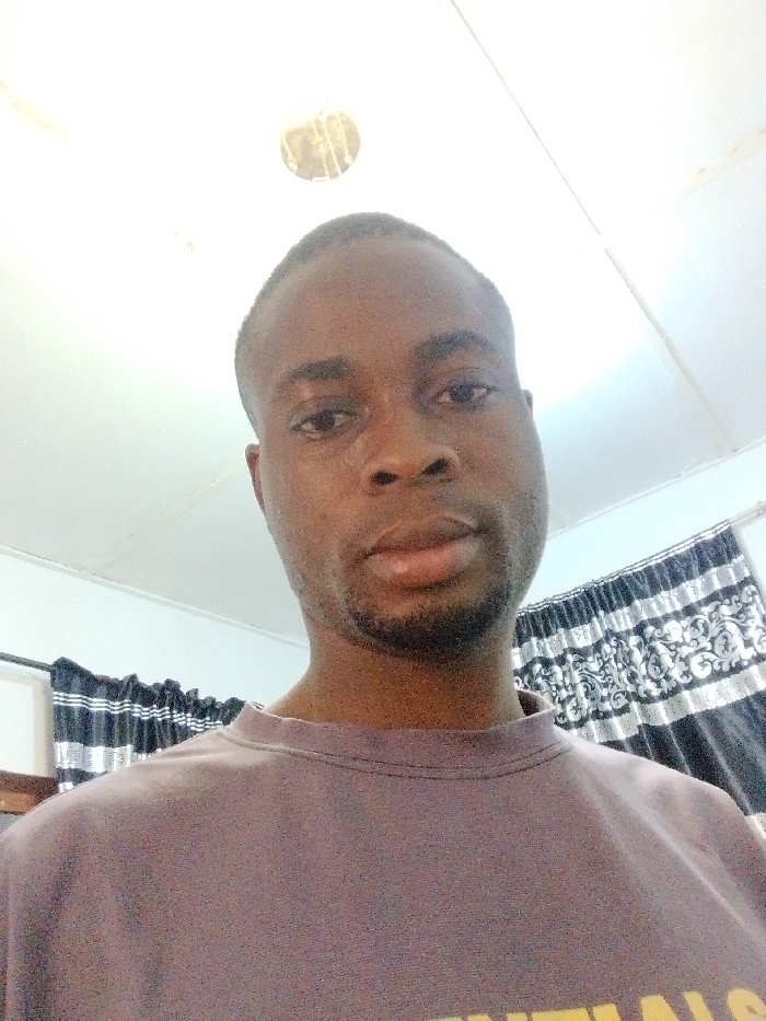 A dark-skinned man poses for a selfie, looking directly at the camera. He has short hair and a trimmed beard. He wears a plain, faded purple t-shirt. Behind him, partially obscured, are black and white patterned curtains. The background also includes a white ceiling with a circular light fixture. The overall lighting is somewhat dim.