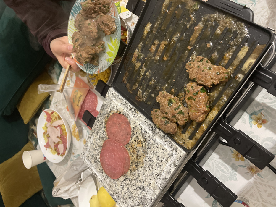 A raclette grill laden with cooked and raw food is angled on a table. The grill has a griddle section with meat patties and a stone section with salami slices. A plate held by a person displays more meat patties. Other visible dishes include a salad and a corn mixture. The table is covered in a floral tablecloth, and a green couch with yellow pillows is partially visible.