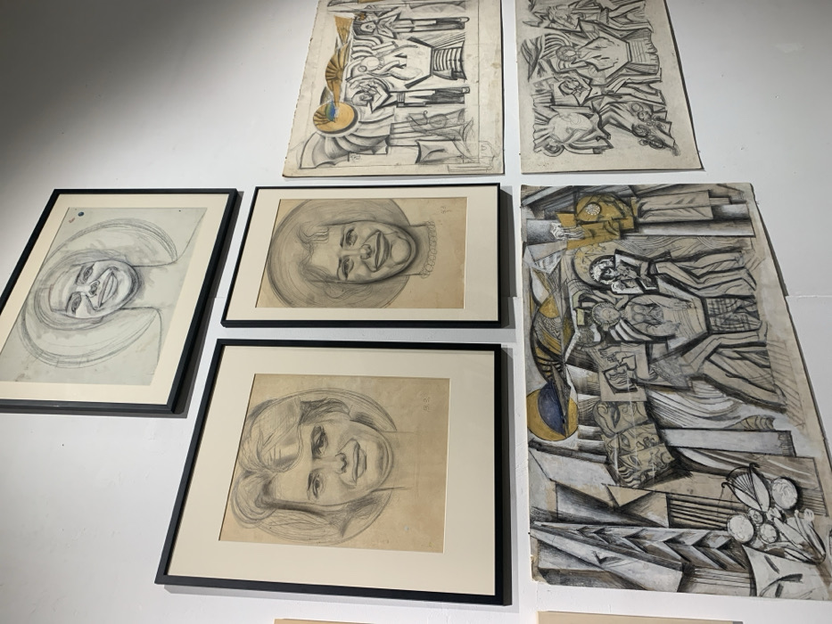 The image features a collection of framed and unframed drawings hung on a white wall. Three framed portraits depict smiling women, rendered in pencil or charcoal. Adjacent to these are three abstract, unframed drawings with cubist elements. One incorporates a yellow and blue accent. The compositions are complex, using angular lines and geometric shapes. The drawings have a vintage look.