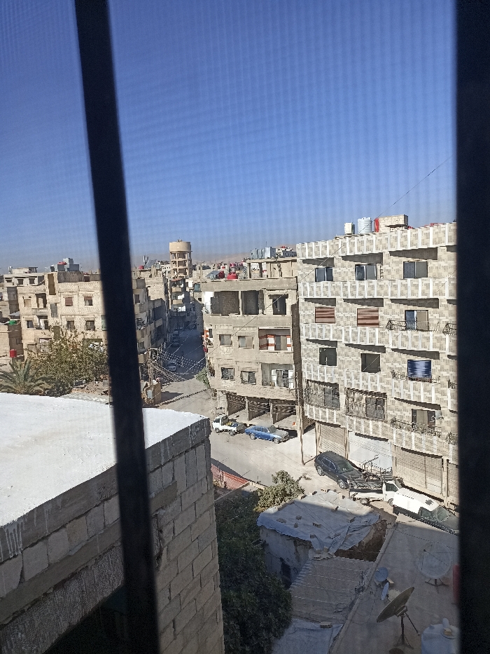 This image depicts an elevated view of an urban area in Mu'adammiyat ash-Sham, Syria, under a clear, bright blue sky