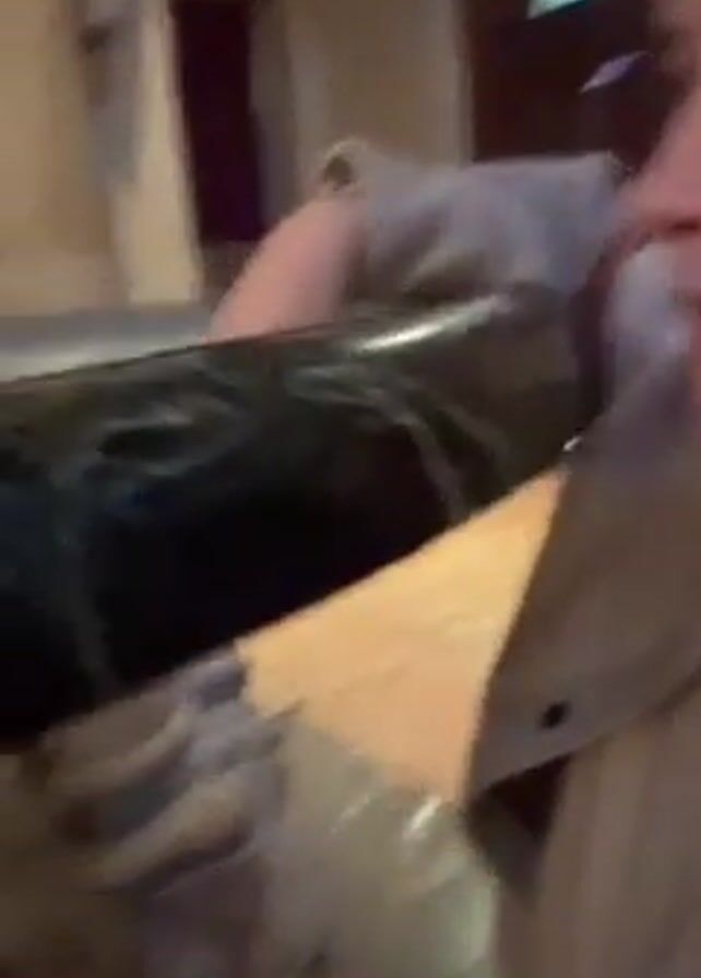 A person wearing a light beige jacket is standing in a building. They are holding a phone or camera, recording a video. They touch the edge of a dark-colored stone or marble basin that has swirling white patterns. The person then lifts their hand, displaying a ring on their finger, and brings their hand up to their forehead as if wiping sweat away. The background includes marble floors and walls, wooden doors, and a sign with text.