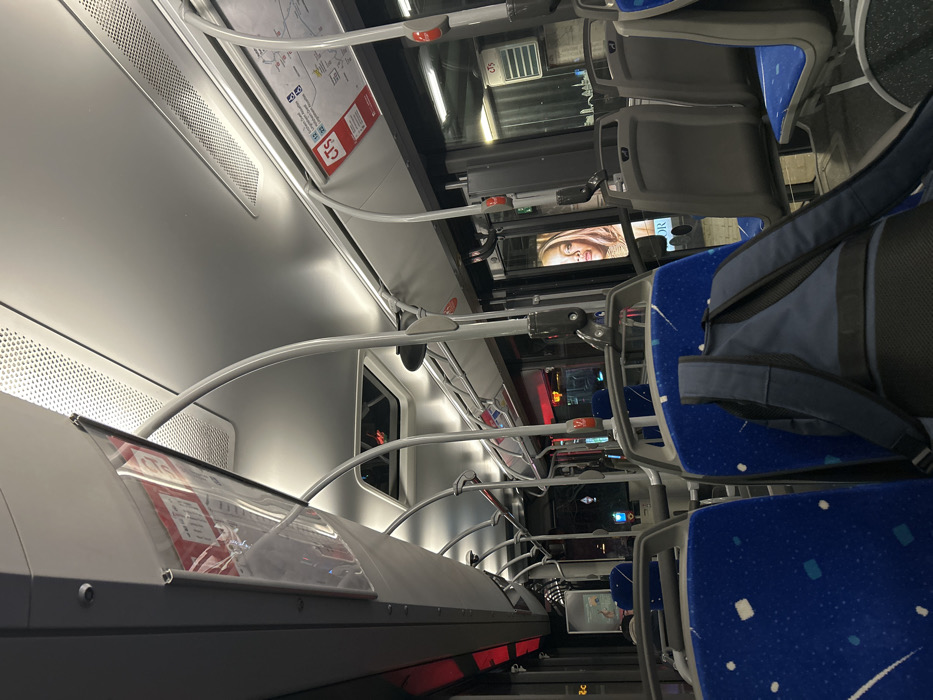 The interior of a public transport vehicle, likely a bus or train, is visible. Rows of blue patterned seats line the aisle, some with backpacks resting on them. Overhead, handrails arch across the ceiling, with maps and informational signs displayed. Outside the windows, glimpses of urban structures and advertisements are visible. The overall lighting is bright, creating a clean and modern atmosphere.