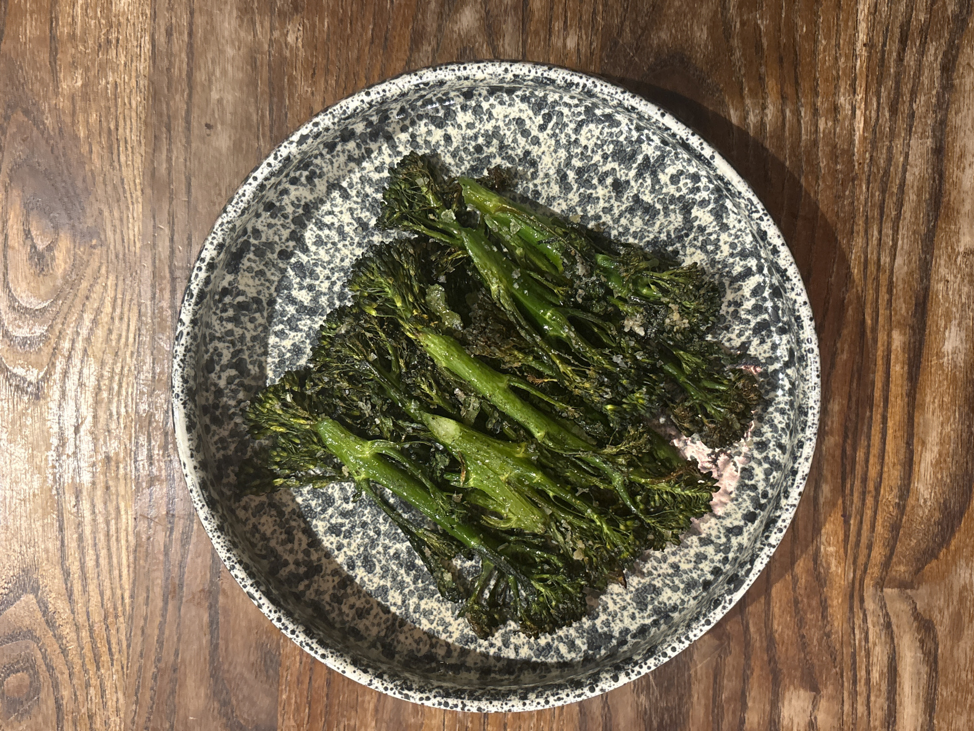 A round, shallow ceramic plate, featuring a speckled dark grey and off-white pattern, is positioned centrally on a wooden table. The plate contains a portion of cooked broccolini, characterized by dark green stalks and florets, some exhibiting slight charring, and coarse white salt crystals visibly scattered across the surface. The underlying wooden table displays a medium-brown tone with distinct grain patterns. The scene is static, devoid of human presence or overt action, and is situated indoors within the city of London, United Kingdom.
