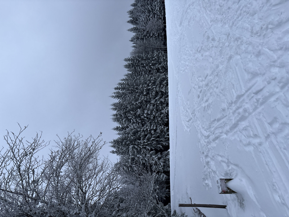 The image presents a snow-covered winter landscape in Le Hohwald, France, under an overcast sky. The foreground consists of a field blanketed in deep snow, showing multiple parallel ski tracks and various boot or snowshoe impressions indicating recent activity. On the far left, a vertical wooden post with a horizontal cross-member is partially embedded in the snow. Adjacent and slightly to its right, a low, square object with a reddish-brown top surface is partially visible, protruding from a triangular mound of snow. The midground is dominated by a dense, linear row of snow-laden evergreen trees, primarily fir or spruce, forming a dark forest boundary across the scene. In the upper left quadrant, the snow-covered bare branches of a large deciduous tree extend into the frame. The background is a uniformly light grey, featureless sky. No individuals are present.