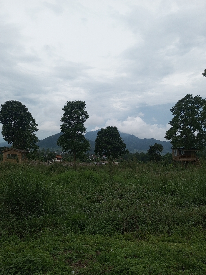 The scene presents an overgrown field in Abbireddygudem, India, under an overcast sky. The foreground and midground are dominated by dense green vegetation, including tall grasses and various plant species. Five prominent trees with dark green foliage are distributed across the midground. To the far left, a small, light-wood building with a pitched roof and multiple windows is partially visible amongst the foliage. To the far right, an elevated light-wood structure, consistent with a treehouse on stilts and featuring a small deck, is observed. In the distant background, mountainous terrain is partially obscured by clouds and atmospheric haze. Faint indications of residential structures are discernible within the midground area. No individuals, animals, or specific actions are observed within the frame.