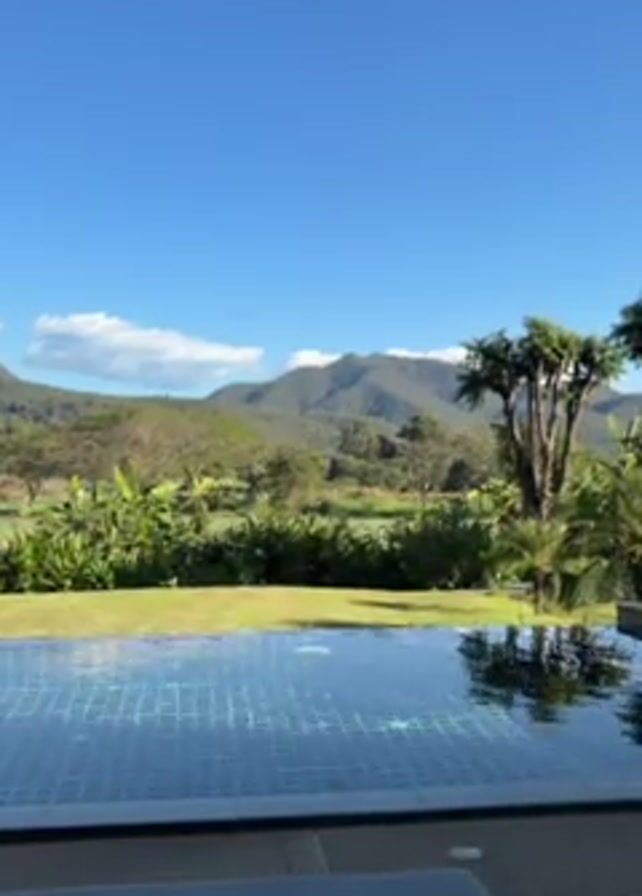The camera is stationary and shows a view from a pool in a lush, tropical setting. The pool's water reflects the blue sky and hints of clouds. Beyond the pool is a green lawn, followed by various trees and shrubs. In the distance are hills or mountains under the clear sky. The overall impression is that the setting is serene and natural. The edge of a lounge chair is visible at the bottom of the frame. Towards the end of the clip, orange-colored planters are revealed.