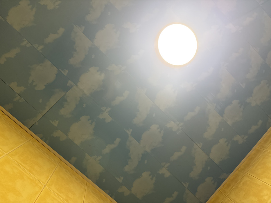 The image displays an upward-angled view of an interior ceiling and a section of a tiled wall. The ceiling is constructed from rectangular panels, light blue in color, patterned with diffuse white clouds, and arranged in a diagonal orientation across the frame. A single, bright, circular light fixture is embedded into the lower right portion of the ceiling, emitting a strong white light. Adjoining the ceiling on the left side of the image is a wall covered with uniform square, glossy yellow-orange ceramic tiles. No individuals, actions, or specific external identifying features confirming a location in Provadia, Bulgaria, are present within the depicted indoor environment.