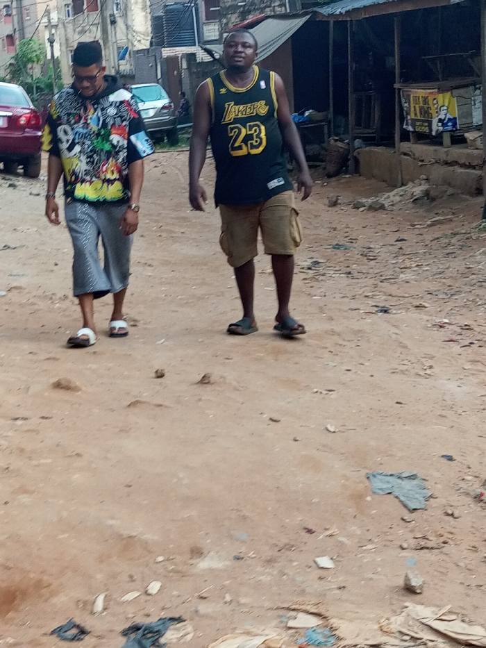 The image displays an unpaved, reddish-brown dirt road in Awada, Nigeria, with two adult males walking towards the camera