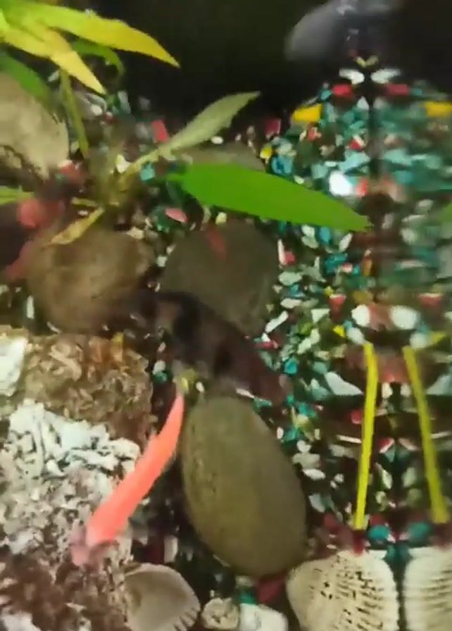 close-up of the bottom of a fish tank. The tank is decorated with colorful gravel, rocks, seashells, and live plants. Several fish, including a bright orange one, swim amongst the decorations. The water appears clear. The camera is handheld and slightly shaky, occasionally blurring the image.