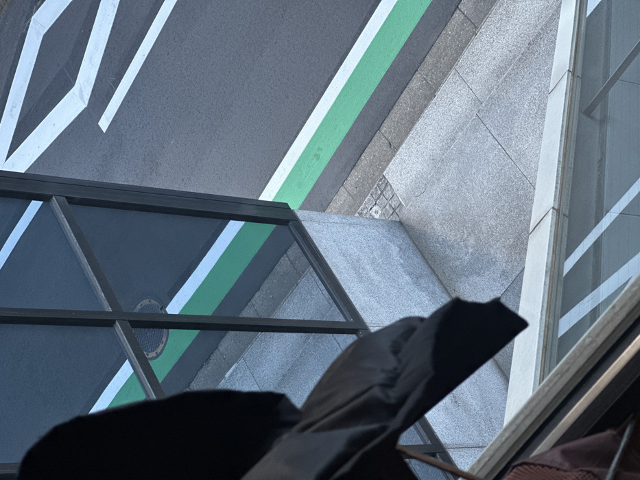 An overhead shot depicts a cityscape fragment. A black framed glass structure reflects white and green stripes from a road. Adjacent to it, stone tiles meet the road's edge. To the right, a building with reflective windows and metal framework is visible. A black jacket lies across the foreground.