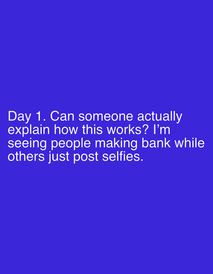 The image is a text-based post. The text, written in white, is set against a solid blue background. The text reads, "Day 1. Can someone actually explain how this works? I'm seeing people making bank while others just post selfies." The font appears to be sans-serif and is relatively large. The layout is simple, with the text centered vertically and horizontally within the frame.