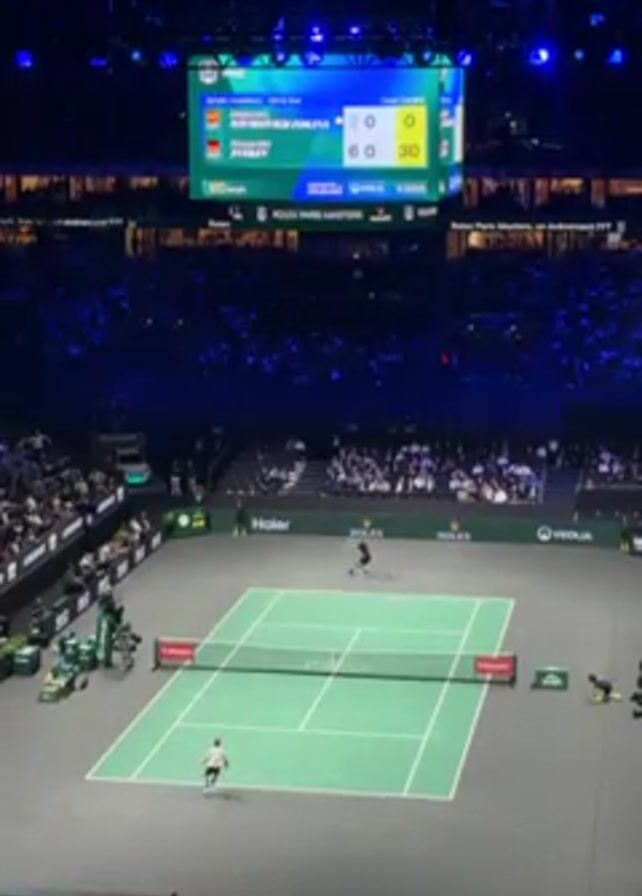 tennis match in progress from a high-angle perspective, likely from the stands. The court is green, and the players are positioned on either side of the net, engaging in a rally. The scoreboard above shows the match details, indicating the score. The arena is filled with spectators, and there are sponsor logos displayed around the court. There are two ball boys located on each side of the court, positioned closer to the corners. The lighting in the arena is bright, with spotlights focused on the court.