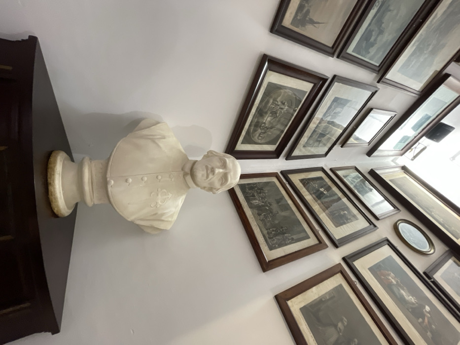 The image displays an interior corner of a building, identified as being in Bunyola, Spain. A white, marble-like bust of a man is centrally positioned on a dark, polished wooden corner table. The bust depicts a male figure with a serious expression, short hair, and is dressed in a formal garment featuring buttons down the front and an emblem, resembling a coat of arms or crest, on the right side of the chest. The bust rests on a fluted pedestal with a circular base, exhibiting some discoloration. The white walls on both sides of the corner are densely covered with approximately 15-20 framed artworks. These artworks, enclosed in dark wooden frames, include prints or drawings depicting various scenes such as landscapes, seascapes with ships, and detailed compositions with multiple figures. An oval-framed object, likely a mirror or picture, is visible on the upper right wall. Bright overhead lighting illuminates the scene, causing reflections on some of the framed glass surfaces.