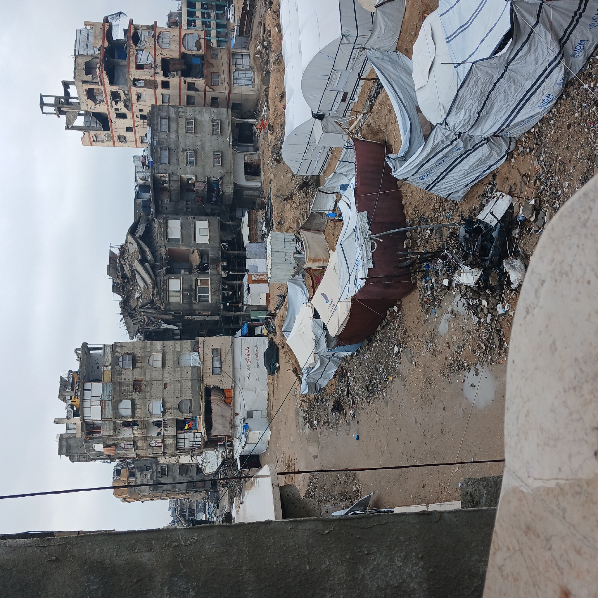 The image displays an elevated view of a severely damaged urban landscape in Gaza City, Palestinian Territory, under an overcast sky. In the foreground, a concrete ledge frames the bottom and left sides. The midground and background are dominated by numerous multi-story buildings, all exhibiting extensive structural damage, including partial collapses, exposed rebar, shattered windows, and widespread impact pockmarks on their facades. One light-colored building on the far right shows significant destruction with an exposed skeletal framework at its apex. The ground level is unpaved, uneven, and heavily covered with debris, rubble, and discarded materials. Multiple puddles of water are present on the muddy earth. A cluster of temporary shelters is erected across the open ground. These include several large, white, arched tents, possibly for humanitarian aid, and numerous smaller, makeshift tents constructed from tarpaulins. Some tarpaulins feature "IOM UN MIGRATION" branding. A dark-colored vehicle, partially covered by a tarp, is visible near a white tent with Arabic text on its side. Electrical lines crisscross the scene. No discernible individuals are engaged in specific activities.