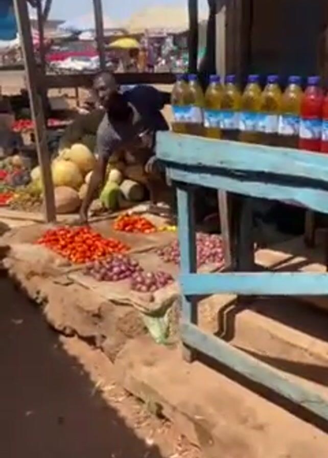 vegetable stand at an outdoor market. The stand is covered with produce including tomatoes, onions, green beans, and gourds. A person in a black shirt is organizing the tomatoes. Bottled drinks are stacked on a shelf next to the stand. Other vendors and shoppers can be seen in the background. The ground appears to be reddish dirt.