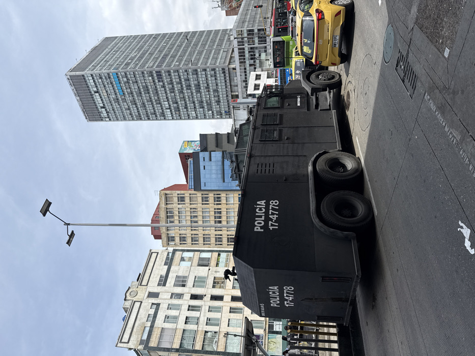 The image presents an urban street scene in downtown Bogotá, Colombia, identifiable by the prominent Edificio Avianca (Avianca Building) located at Carrera 7 and Calle 16, which is visible in the background. In the mid-ground and foreground, a large, dark grey armored police vehicle is stopped on a multi-lane asphalt road, angled slightly away from the viewer. The vehicle is marked with "POLICIA 17-4778" in white lettering on its rear and side, and "BUFALO 5" is also visible on its side. It features multiple small, grilled windows and a black, turret-like device mounted on its roof. To the right of the armored vehicle, a yellow Hyundai Grand i10 Nios taxi, bearing license plate NMW-895, is stopped in traffic. Further down the street, additional vehicles including a red TransMilenio bus and a green bus are visible. On the left side of the frame, several indistinct figures are standing behind a black metal railing, adjacent to what appears to be a bus stop or pedestrian platform. The background consists of several multi-story buildings. The tall, grey, rectilinear Edificio Avianca stands prominently on the right. To its left, an older, light-colored building with classical architectural details is visible, alongside a building featuring a red section and a modern structure with blue glass. A tall, grey street light pole with two luminaires rises centrally in the mid-ground. The asphalt road surface contains multiple circular manhole covers and a rectangular drain grate, with a white, stylized human figure decal on the pavement in the immediate foreground. The sky is overcast with a light grey cloud cover.