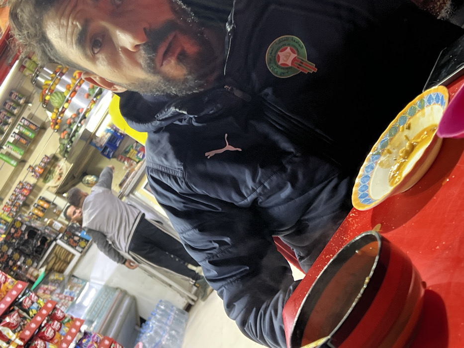 A selfie shows a man with dark hair and a beard, wearing a black jacket with a pink Puma logo and the Morocco national football team emblem. He is seated at a red table with a partially eaten dish on a plate and a red mug filled with liquid. The background depicts a store interior with shelves stocked with various items, including snacks and bottled water. Another person is visible in the background, wearing a grey jacket and black pants.